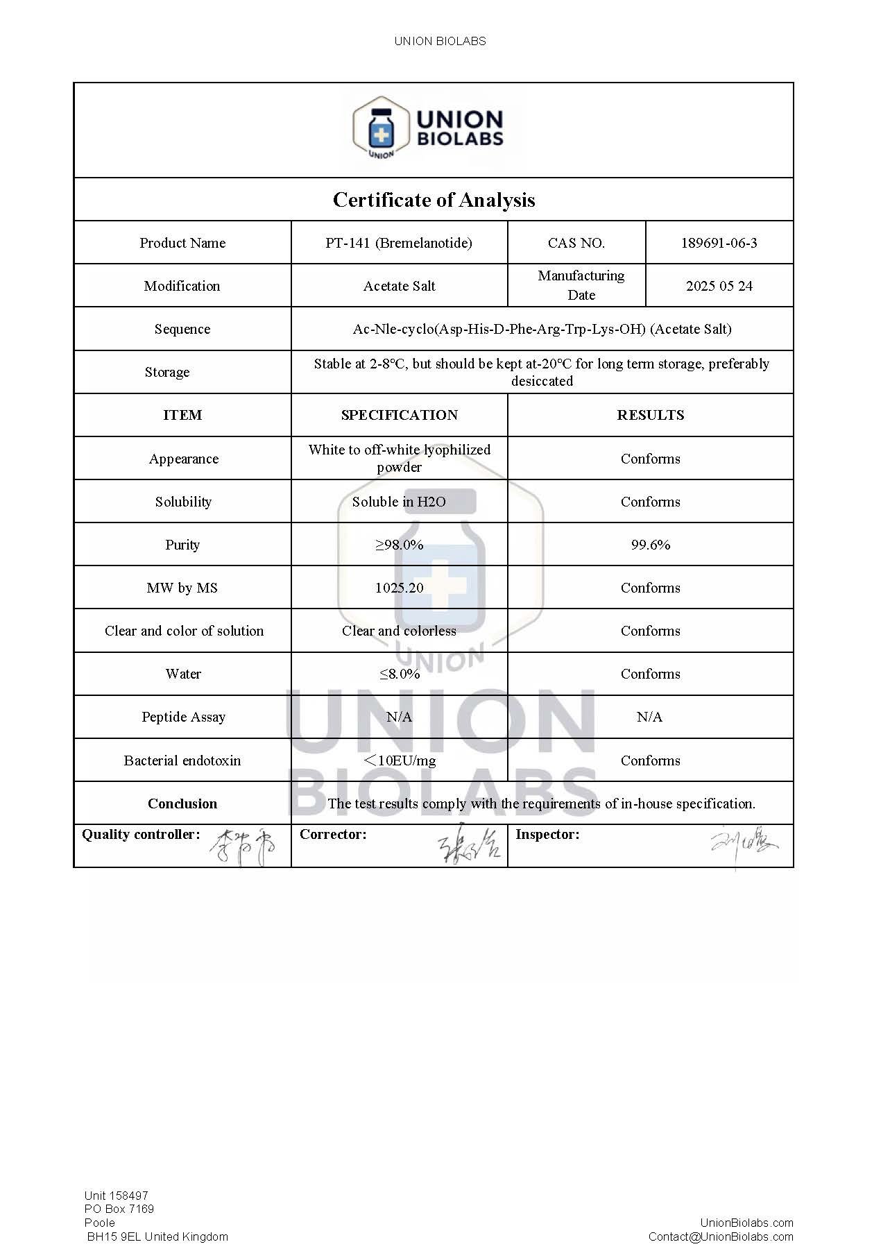 Documentation: COA supplied with every lot